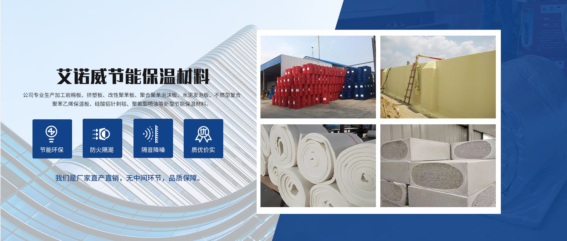 成都艾諾威節能保溫材料有限公司是十多年的新型節能保溫材料生產廠家,廠房位于彭州市。公司專業生產加工巖棉板、擠塑板、改性聚苯板、聚合聚苯泡沫板、水泥發泡板、不燃型復合聚苯乙烯保溫板、硅酸鋁針刺毯、聚氨酯噴涂等新型節能保溫材料。我們是廠家直產直銷,無中間環節,品質保障。 作為行業內的佼佼者,艾諾威擁有先進的生產設備和專業的技術團隊,專注于生產加工巖棉板、擠塑板、改性聚苯板、聚合聚苯泡沫板、水泥發泡板、不燃型復合聚苯乙烯保溫板、硅酸鋁針刺毯以及聚氨酯...